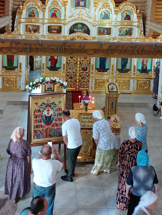После войсковой части Крестный ход направился в Иверский храм, где его ждал торжественный прием. Под звон колоколов и пение тропарей, чтимая икона и ковчег были установлены в храме.